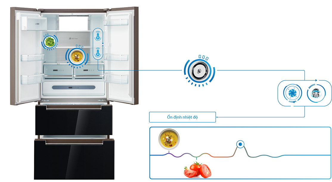 Hệ thống cảm ứng sẽ tự động nhận biết nhiệt độ thay đổi bên trong dựa vào nhiệt độ thực phẩm, sau đó sẽ truyền tín hiệu đến thiết bị để tự động điều chỉnh nhiệt độ phù hợp nhất giúp ngăn chặn sự thay đổi nhiệt độ bất thương.