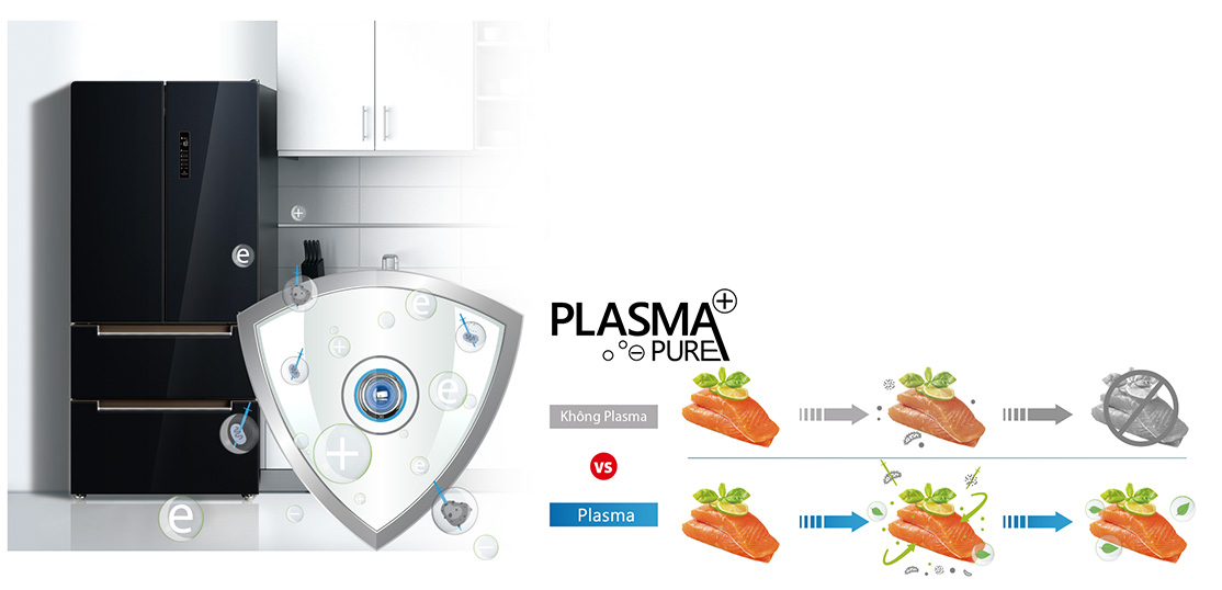 Ở chiếc tủ lạnh Toshiba Inverter 500 Lít GR-RF532WE-PGV, công nghệ Plasma + Pure sẽ có khả năng tạo ra các ion dương và ion âm trong môi trường không khí lạnh. Các ion này thì sẽ xâm nhập vào vi khuẩn và ở trên bề mặt tế bào vi sinh vật có ở bên trong tủ, gây mất khả năng hoạt động của chúng, giúp kháng khuẩn, khử mùi hiệu quả, và trả lại bầu không gian trong lành, không bám mùi hôi khó chịu cho tủ lạnh.