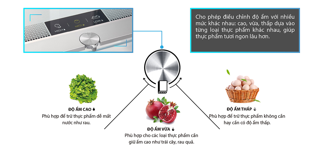 Ngăn giữ ẩm này cho phép điều chỉnh độ ẩm với nhiều mức khác nhau cao, vừa, thấp dựa vào từng loại thực phẩm khác nhau giúp thực phẩm tươi ngon lâu hơn.