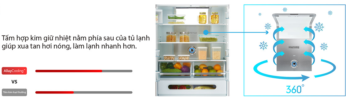 Tấm AlloyCooling giữ lạnh và truyền nhiệt tốtAlloyCooling trên tủ lạnh Toshiba Inverter giúp giữ lạnh cho thực phẩm lâu hơn nếu chẳng may mất điện. Nhờ vậy, thì những món thực phẩm của bạn sẽ được kéo dài thời gian tươi ngon, không bị biến chất hay hư hỏng