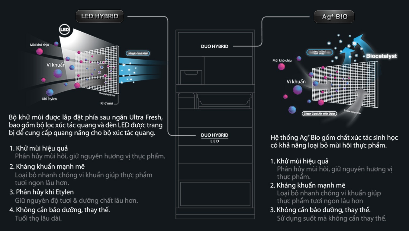 - Hệ thống Duo Hybrid khử mùi kháng khuẩn cho cả ngăn mát và ngăn đông giúp bữa ăn thêm ngon hơn.